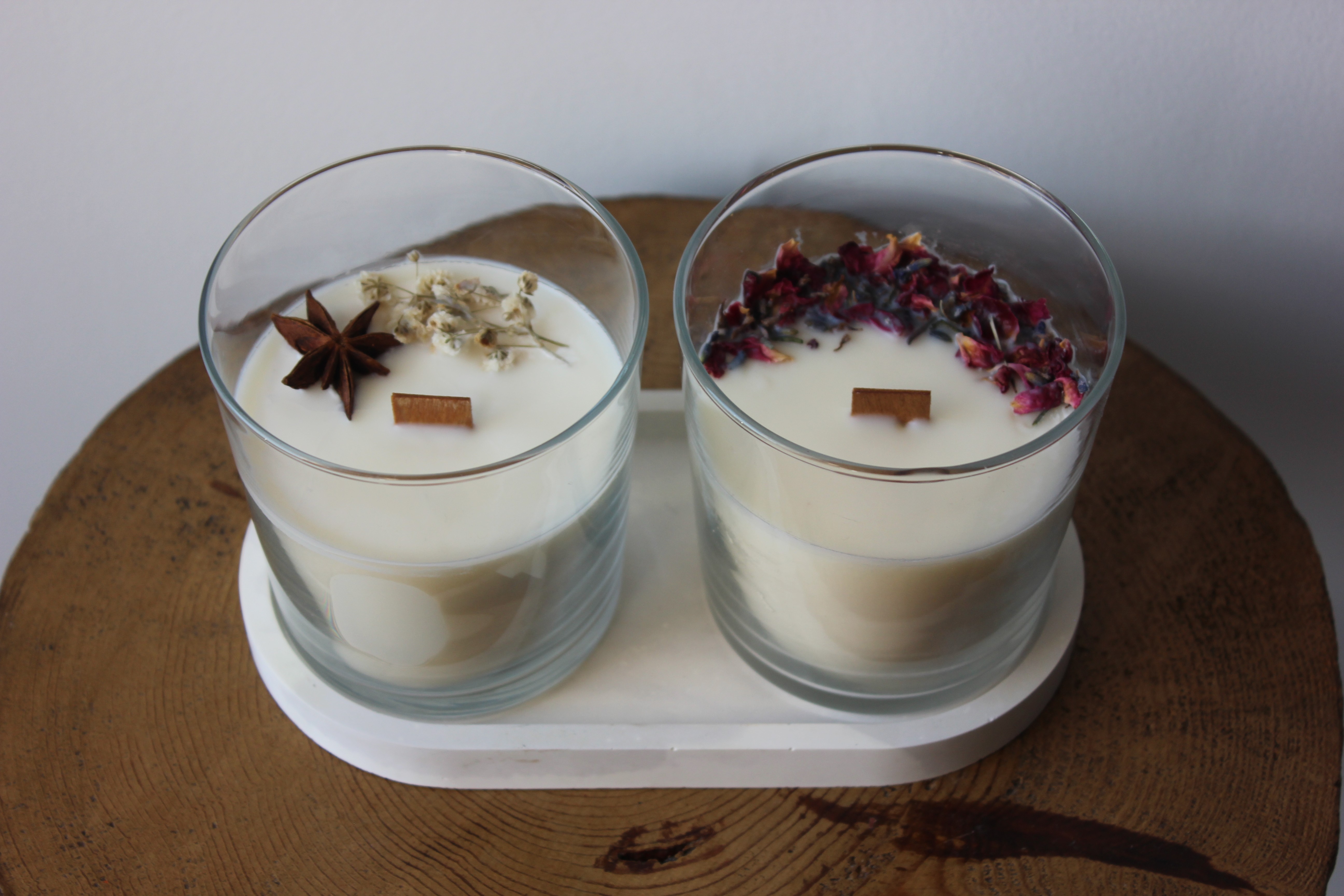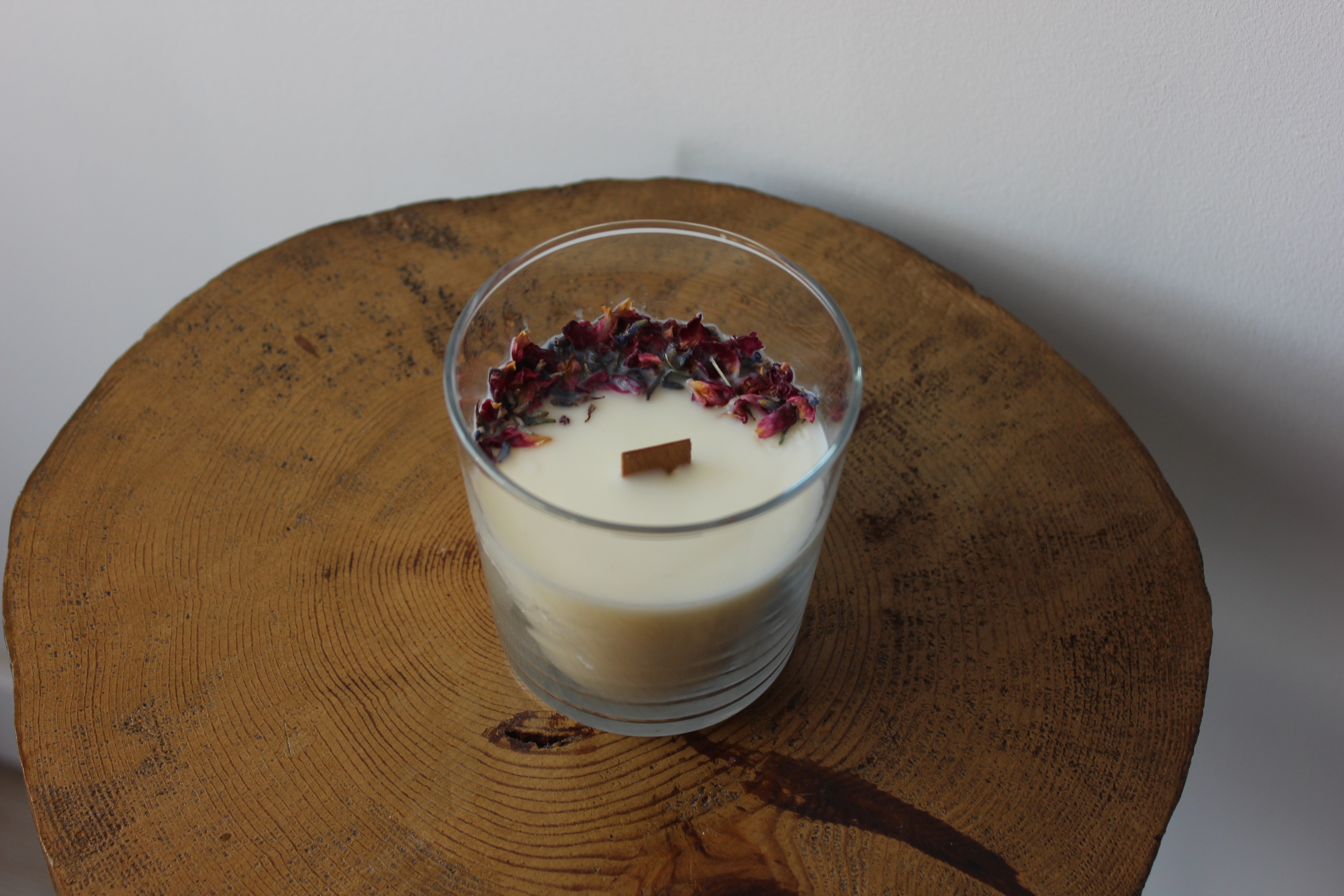 Cada vela se decora con flores secas, como lavanda y pétalos de rosa, que realzan su belleza artesanal y la conectan aún más con la naturaleza.