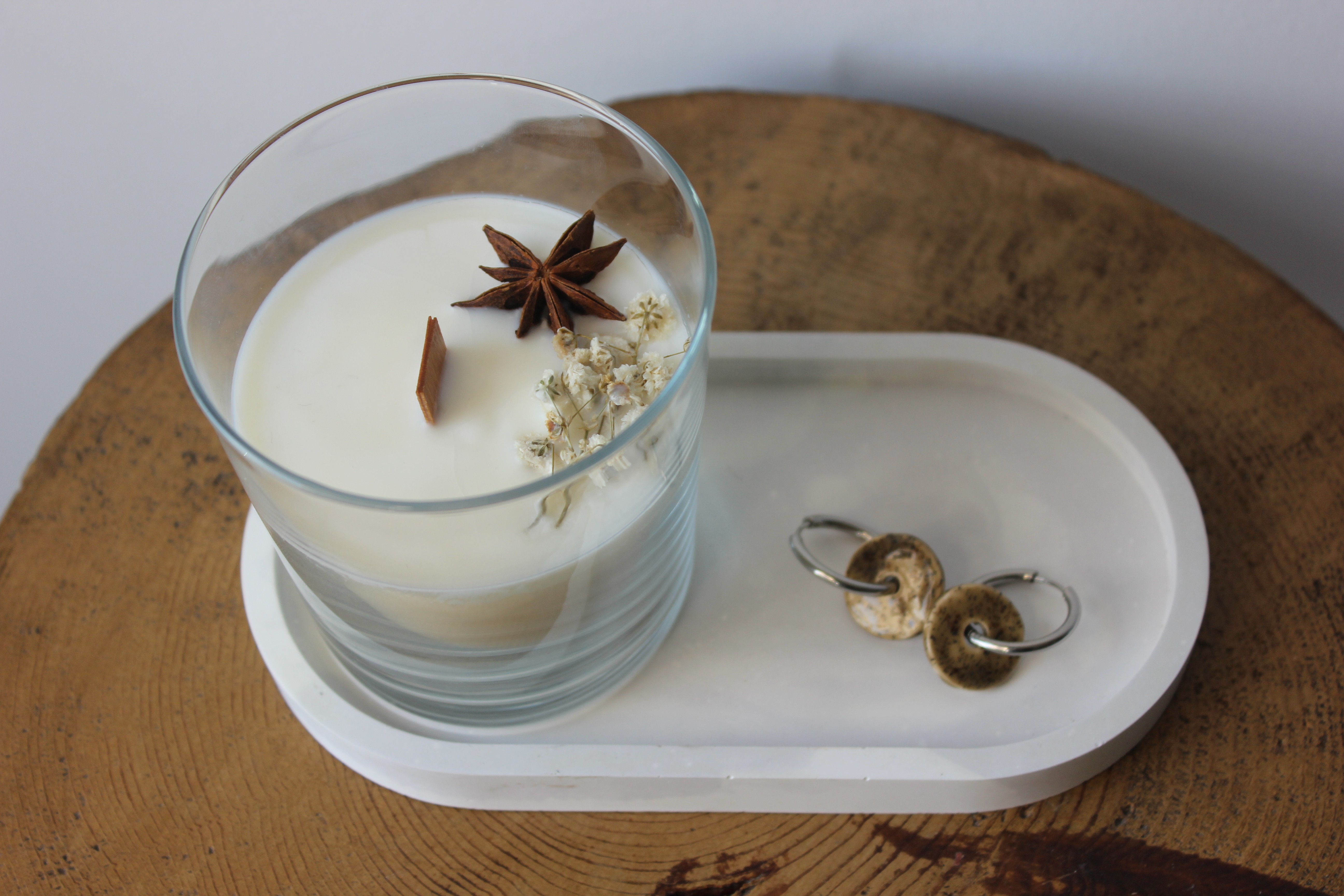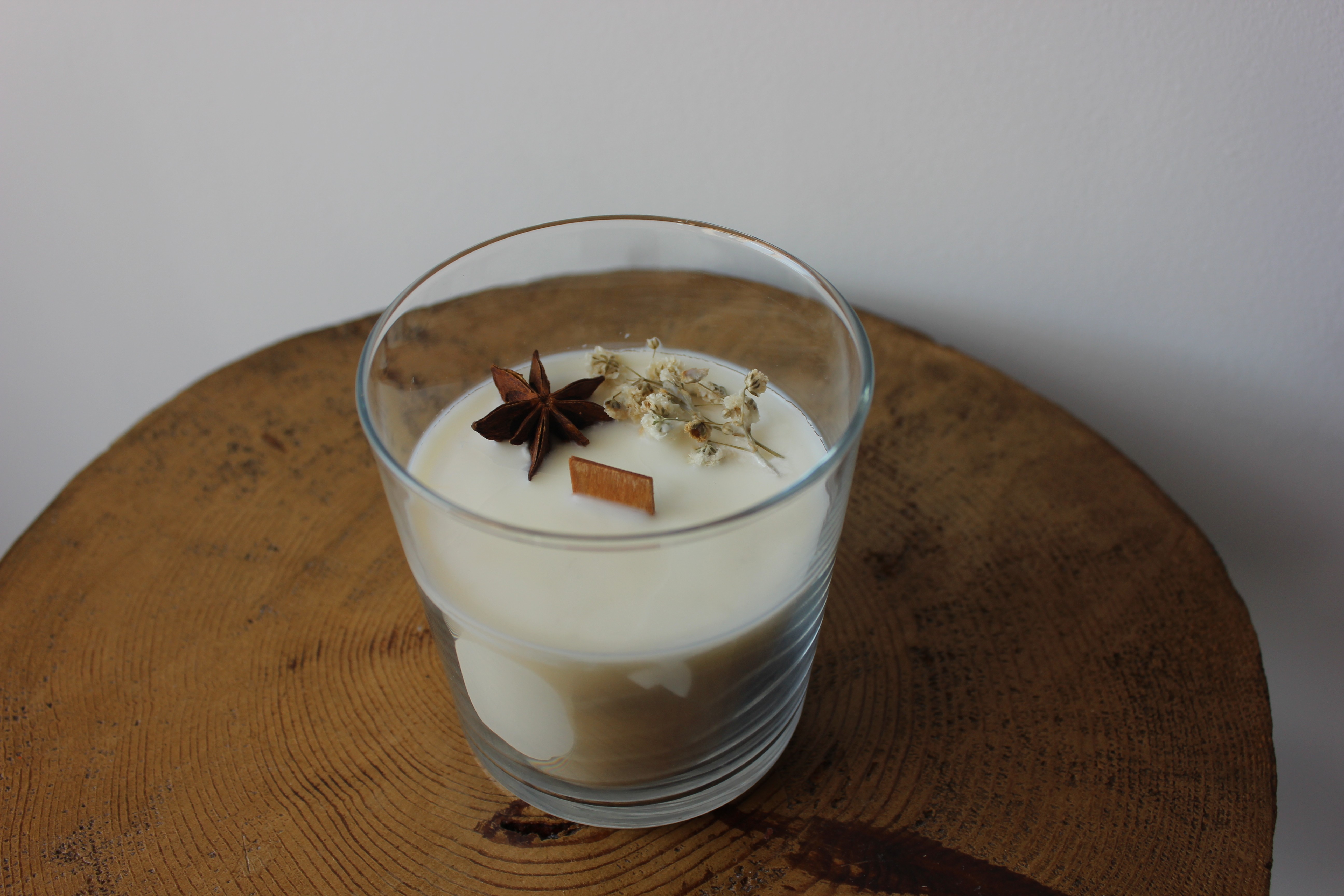 En su superficie, la vela se adorna con flores secas y estrellas de anís natural, que aportan un toque decorativo y aromático, convirtiéndola en una pieza única y llena de belleza artesanal.